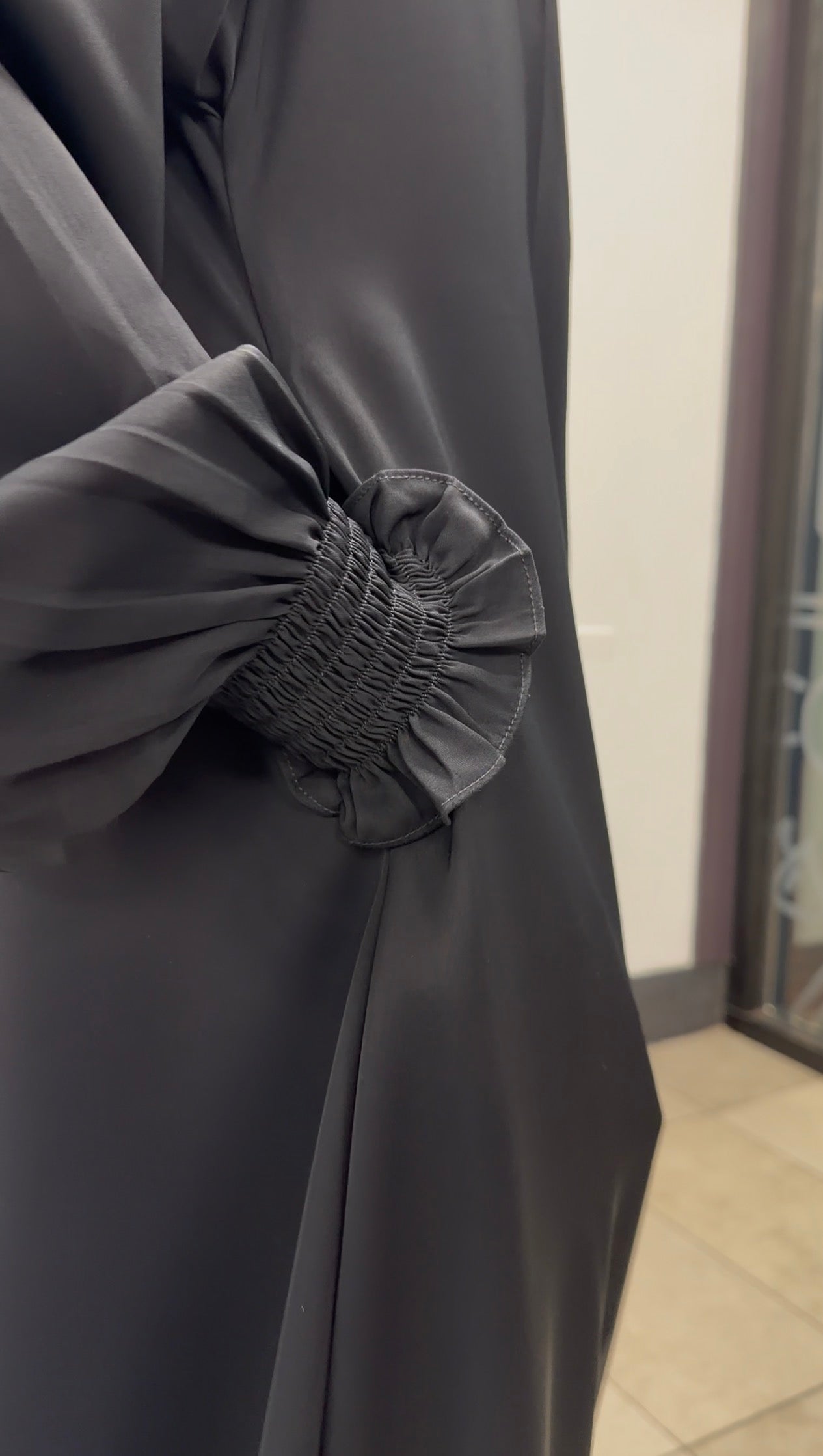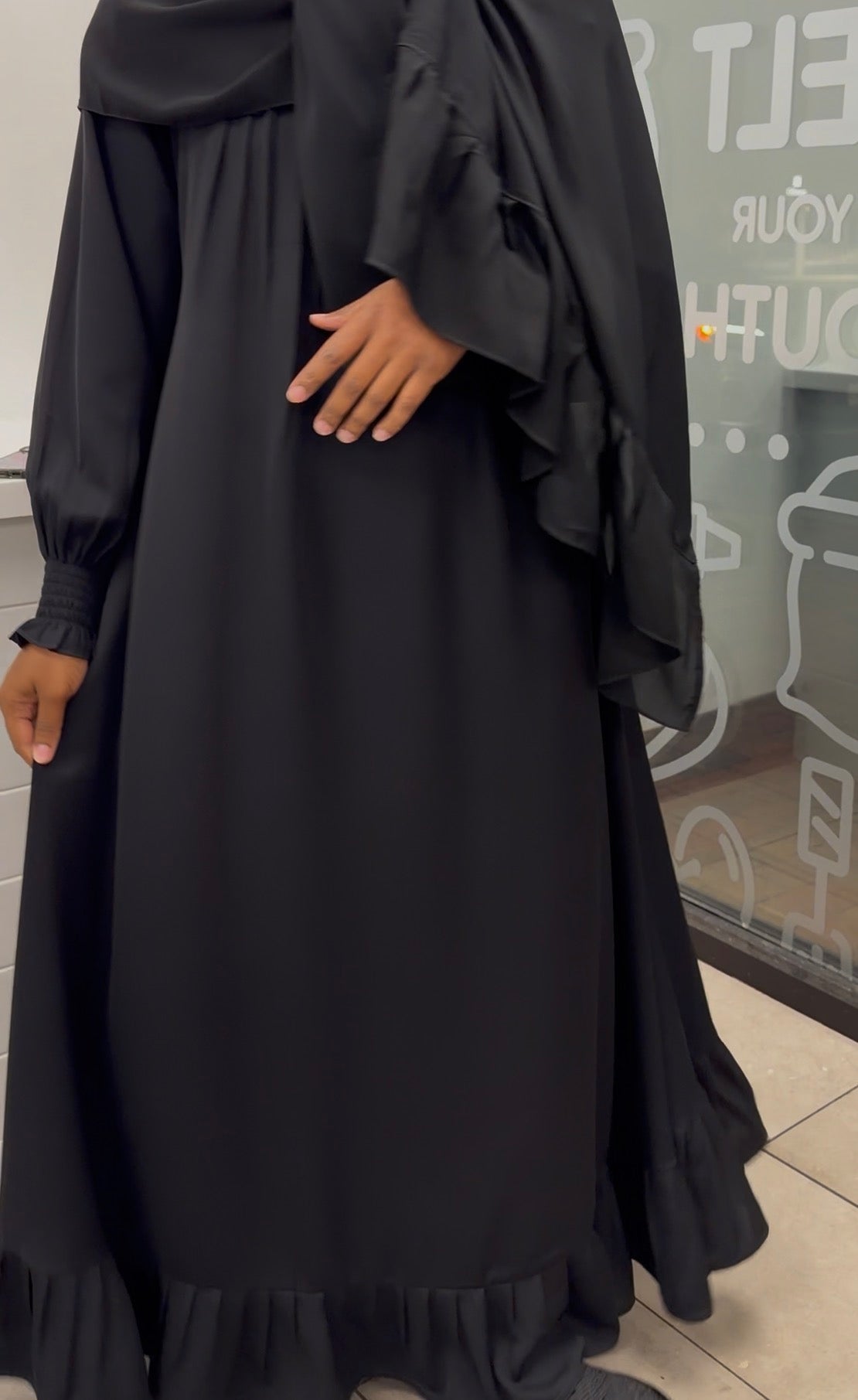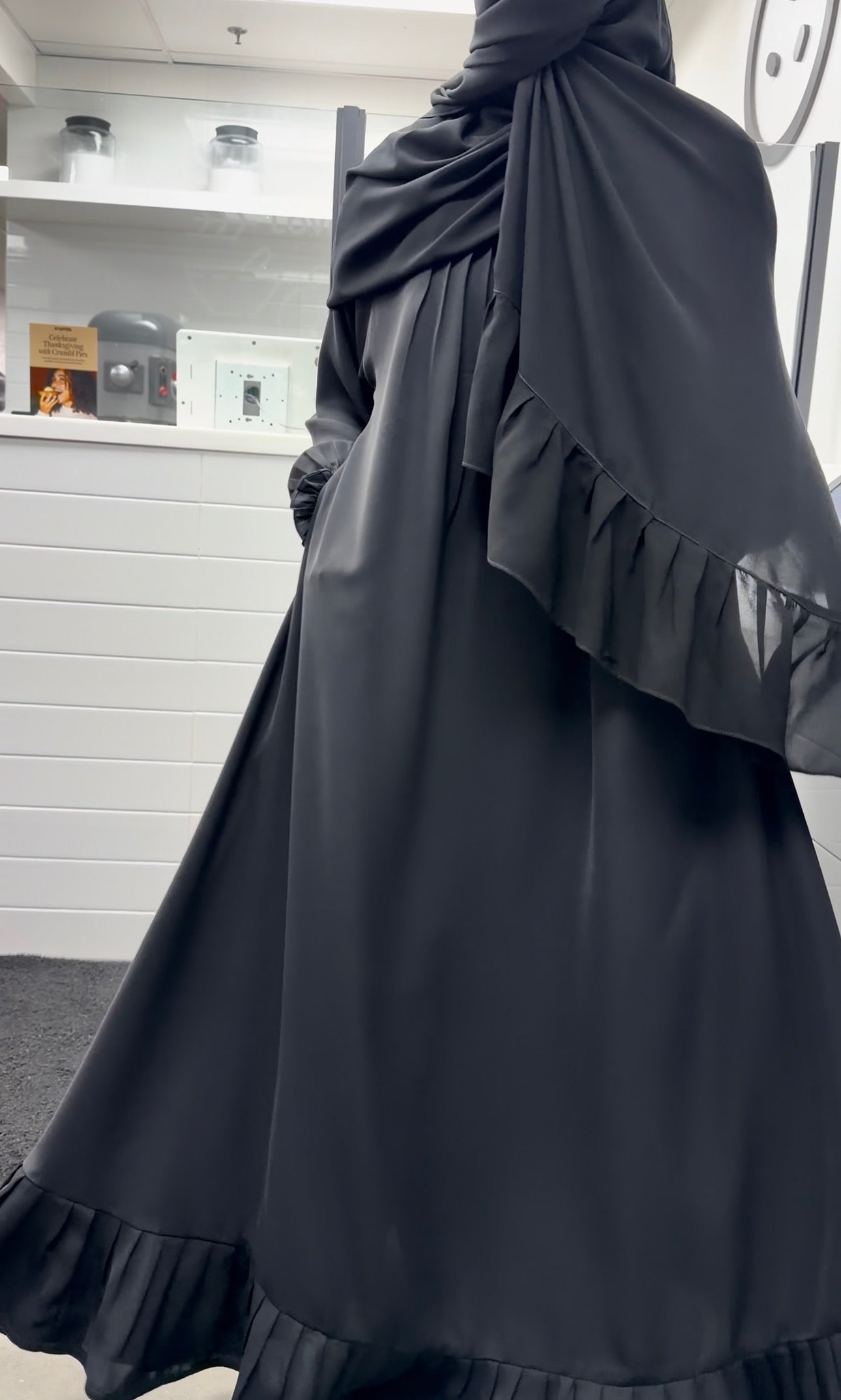Umbrella-style luxury abaya crafted with Premium Nidha fabric, zipper opening at the chest, pockets, and a pleated ruffle bottom. Matching pleated ruffle Shayla is included.