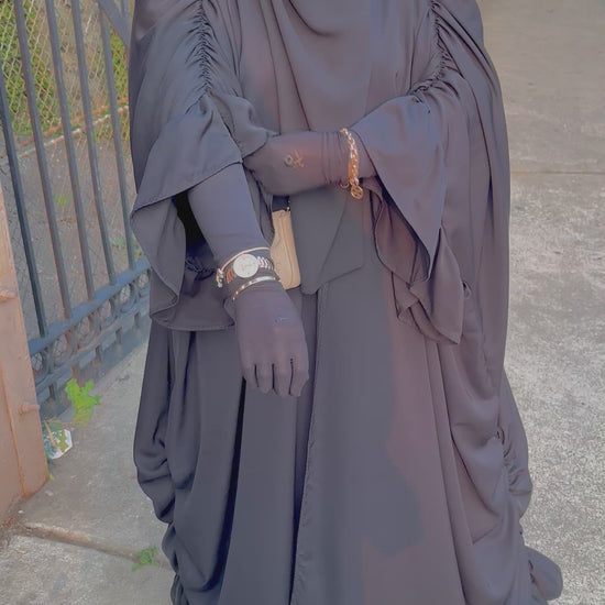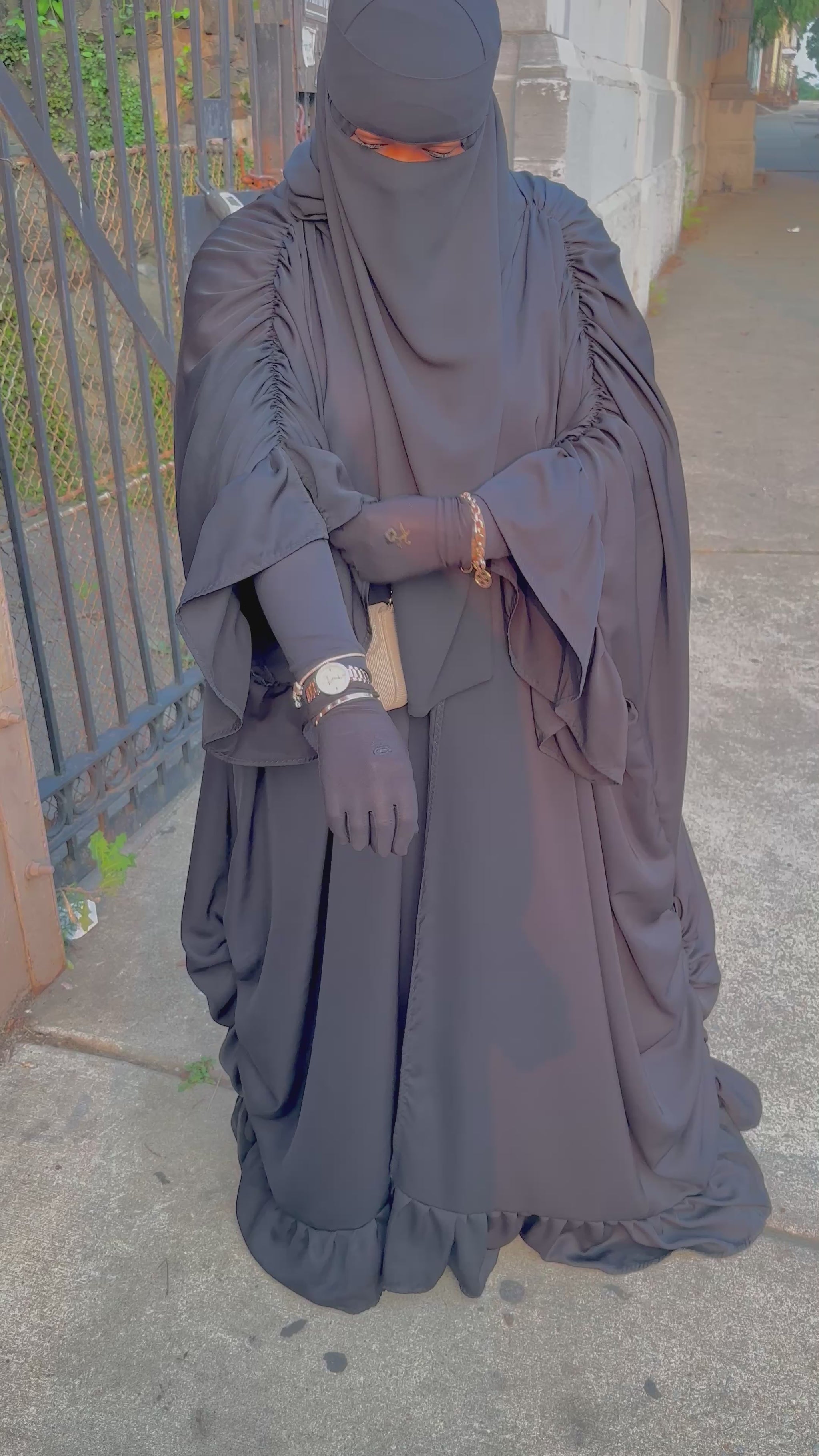 Scrunches & ruffles meet to create this one of a kind, open abaya. Made from high-quality Saudi Nida. Black only. There is elastic at the neck to keep it firm on your shoulders.